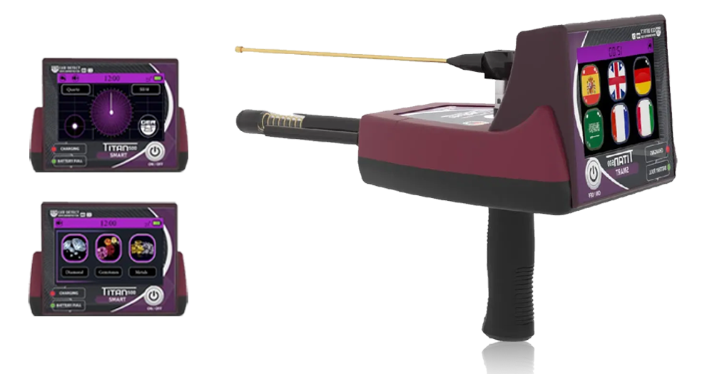 5 search systems in one device for detecting underground treasures. Specialized in detecting gold, hidden treasures, ancient artifacts, voids, caves, and tombs beneath the earth’s surface. It includes a system for depth determination and analysis of underground findings. The device operates in four languages: German, English, French, and Arabic.